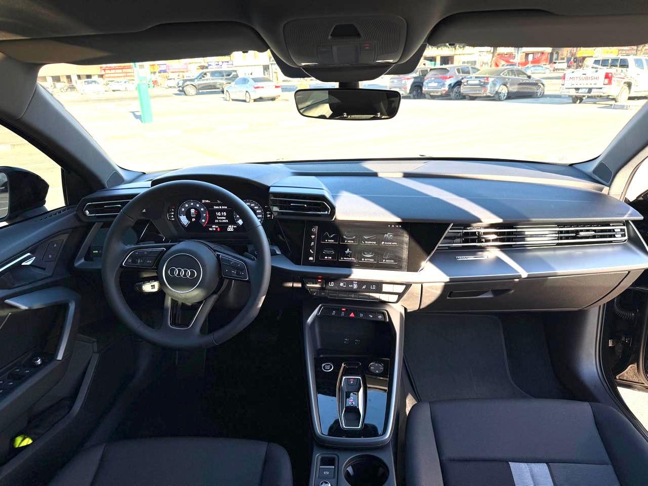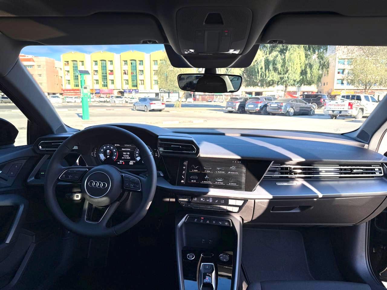 The 2026 Audi A3 represents the latest evolution of Audi's best-selling compact sedan, featuring a refreshed exterior design with a bolder Singleframe grille and sharper LED headlights. Under the bonnet, a refined 1.5-litre turbocharged engine with mild hybrid technology delivers 150 hp through a responsive 7-speed S tronic transmission for spirited yet efficient performance. The sleek black exterior conceals a premium interior with the latest MMI touchscreen infotainment, Audi virtual cockpit plus, wireless Apple CarPlay, wireless charging, and ambient lighting. Adaptive cruise control, a panoramic sunroof, heated leather seats, and parking sensors with a rearview camera complete a thoroughly modern luxury experience.